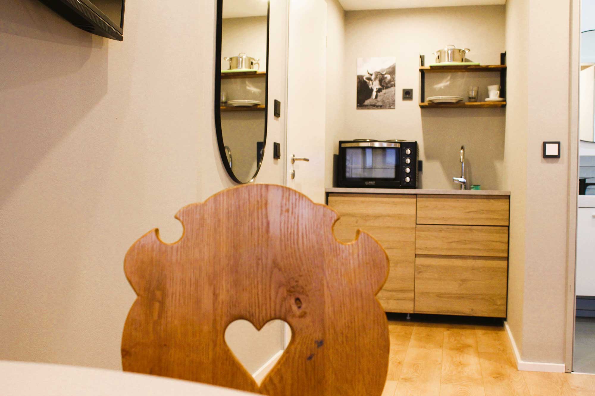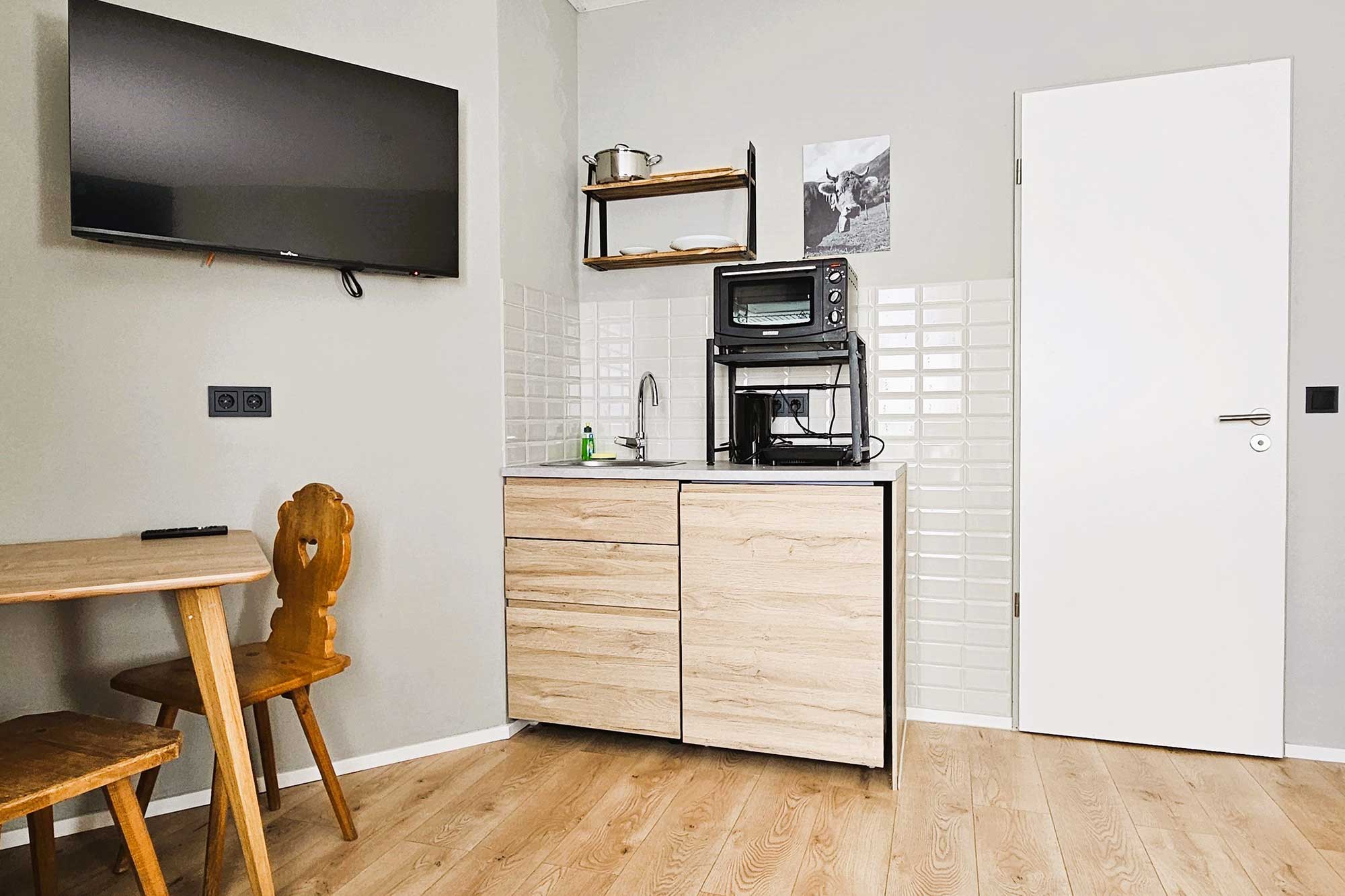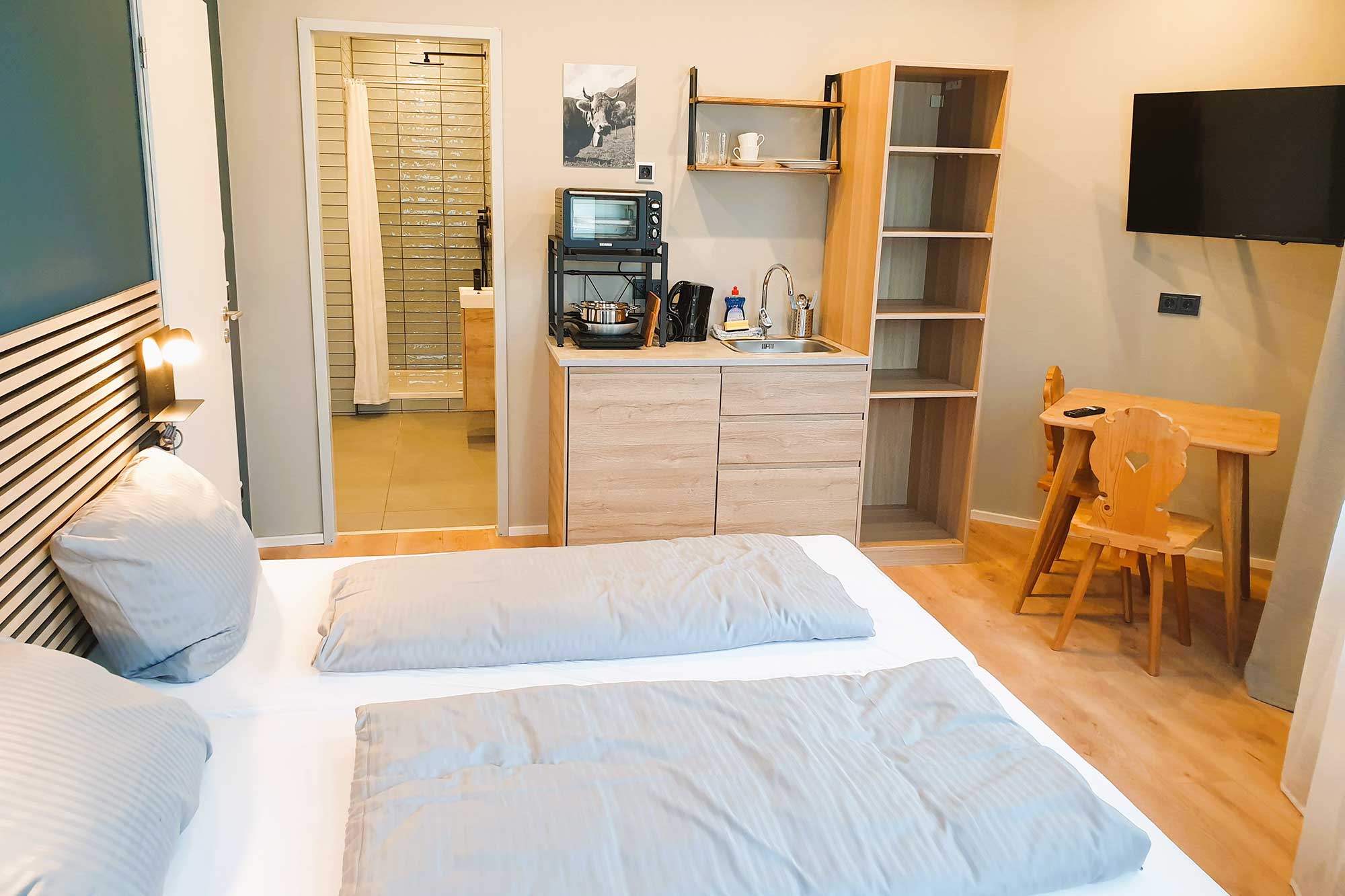 Jede Wohneinheit ist funktional und modern eingerichtet und verfügt über einen Esstisch, einen Kleiderschrank, einen Flachbild-TV sowie ein modernes Badezimmer. Handtücher und Bettwäsche sind selbstverständlich inklusive. Zusätzlich steht Ihnen eine praktische Mini-Küche mit Kühlschrank zur Verfügung – perfekt für Selbstversorger, längere Aufenthalte oder einen entspannten Ferienaufenthalt.