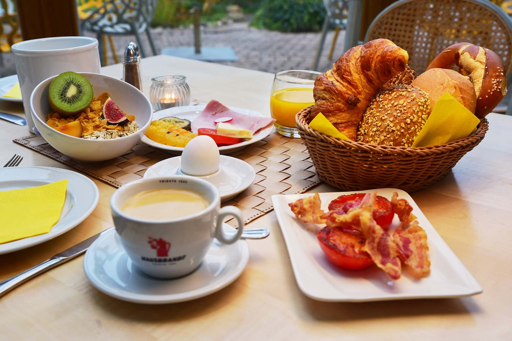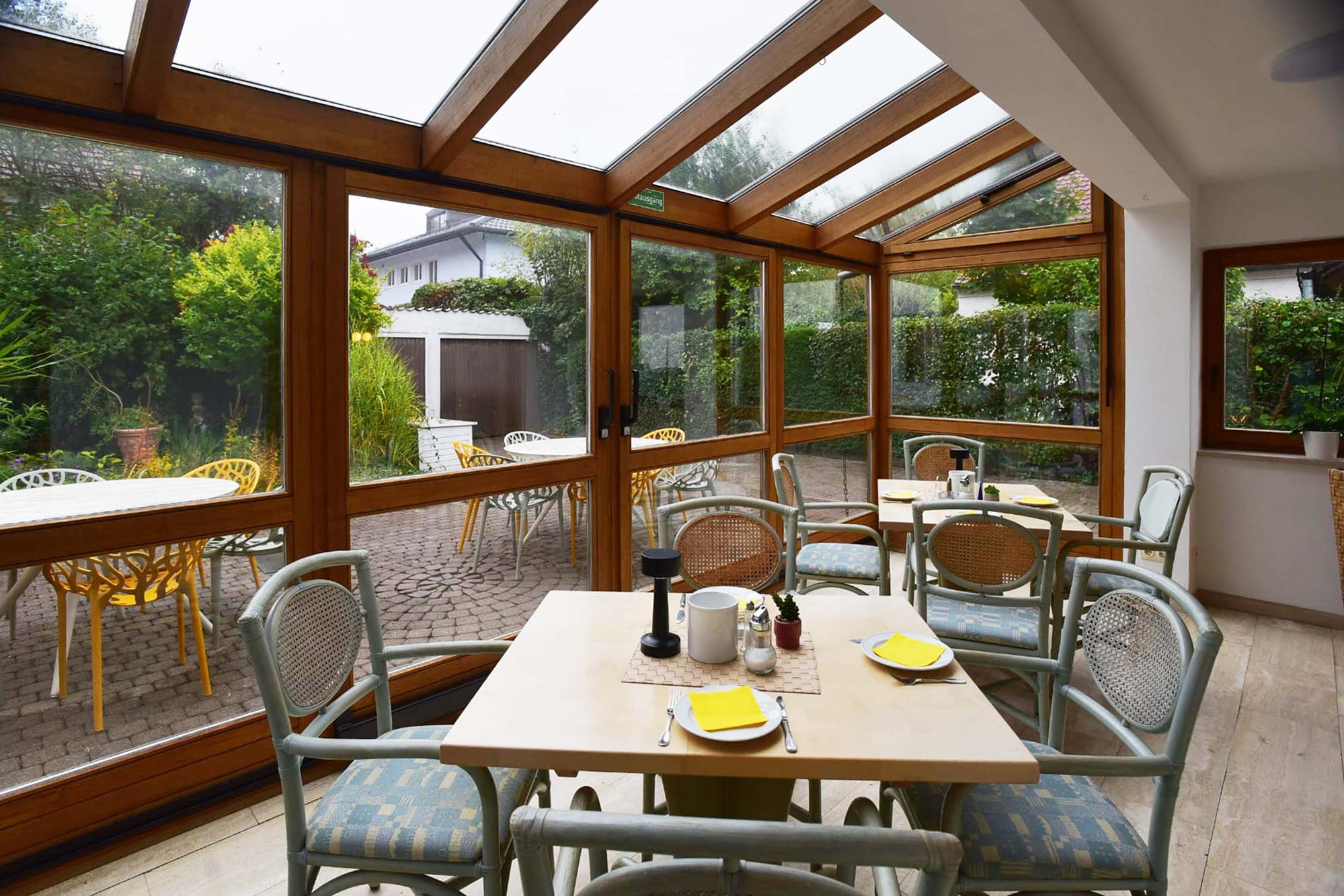 Der einladende Wintergarten mit Blick in den Garten lädt zum Verweilen ein. Bei schönem Wetter lassen sich die Panoramafenster öffnen, sodass Sie die ruhige Atmosphäre genießen und nach Stadtbesichtigungen oder Geschäftsterminen entspannt abschalten können.